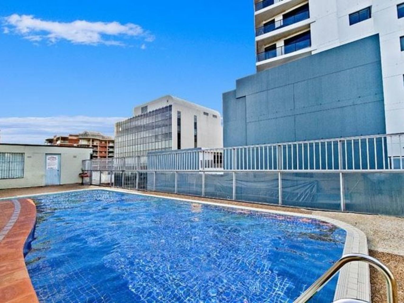 * Sunny rooftop pool, common laundries