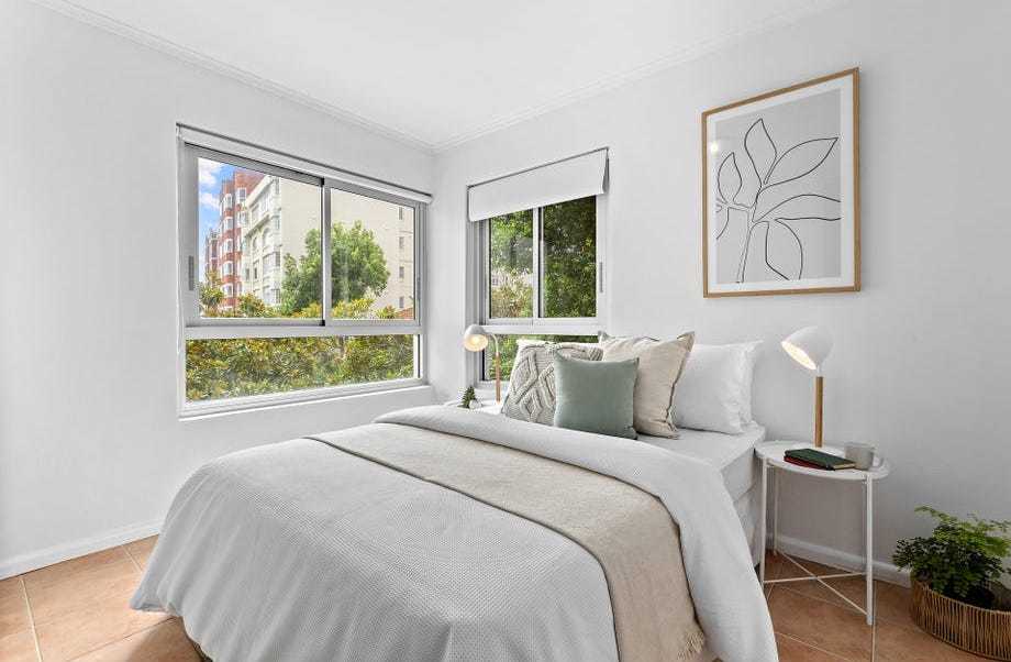 The oversize main bedroom with ensuite has space to include a built-in wardrobe. The long balcony, accessed from both the living room and the main bedroom, captures the sea breezes from Elizabeth Bay Marina and harbourside Beare Park only 120 metres away. The third bedroom includes a full height built-in wardrobe and water glimpses while the second bedroom / study overlooks tree-lined Ithaca Road below. The enormous kitchen includes a dishwasher, excellent storage, space for a full size refrigerator and a servery. The large bathroom with the shower over a full bath also includes unobtrusive laundry facilities. Close to the building entrance, a carspace and secure undercover storeroom is included on title.