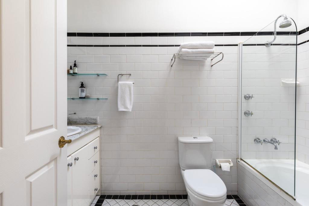 – Skylit upstairs bathroom with bath and marble-topped vanity